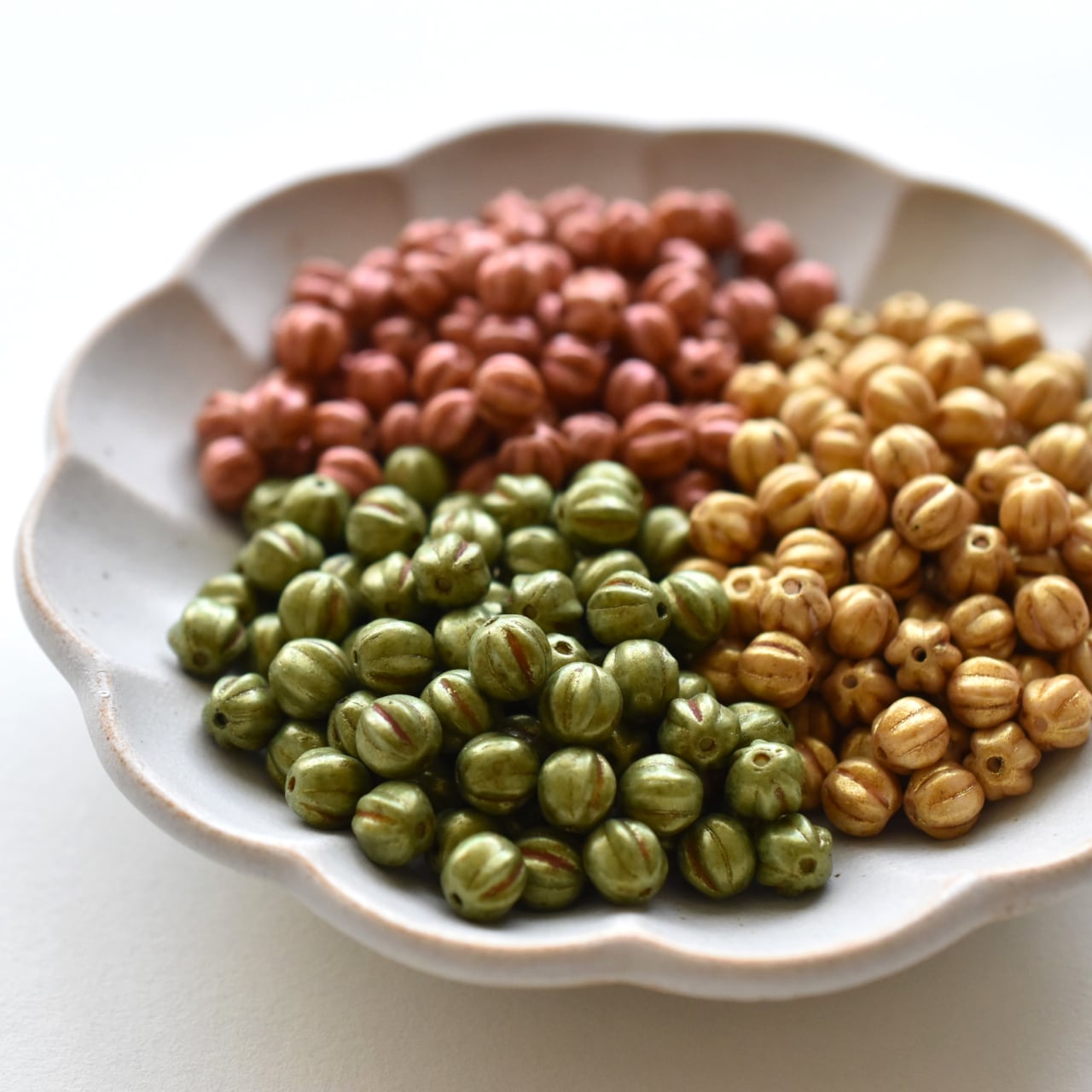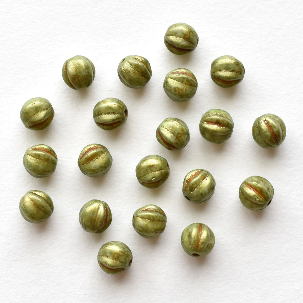 チェコ製ガラスビーズ、メロン型のプレストビーズをアソートにしました。